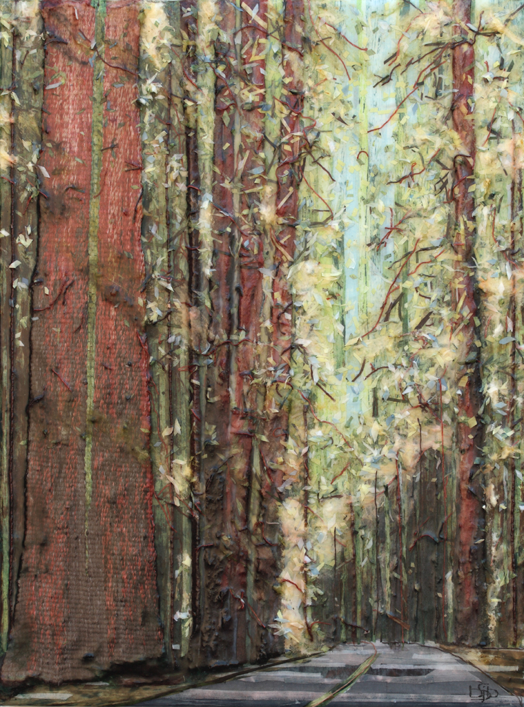 Complex layers of painted/dyed cotton fabric, cotton batting, died raw ginned cotton and cotton yarn. Layers are assembled with Acrylic Mediums on a Wood Panel.