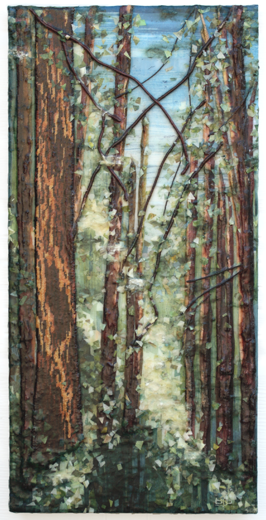 Complex layers of painted/dyed cotton fabric, cotton batting, died raw ginned cotton and cotton yarn. Layers are assembled with Acrylic Mediums on a Wood Panel.