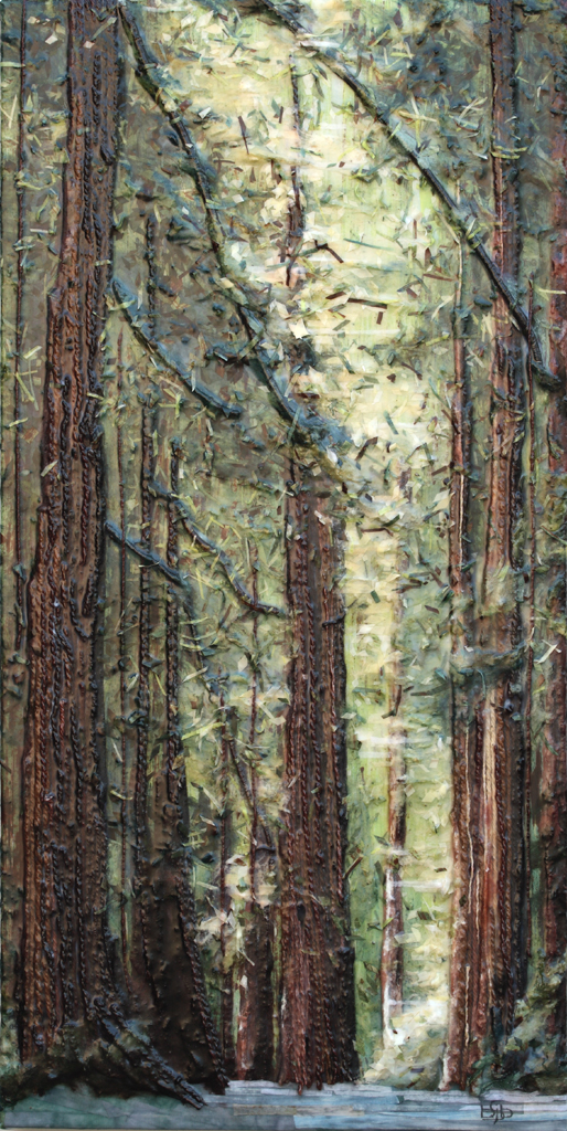 Complex layers of painted/dyed cotton fabric, cotton batting, died raw ginned cotton and cotton yarn. Layers are assembled with Acrylic Mediums on a Wood Panel.